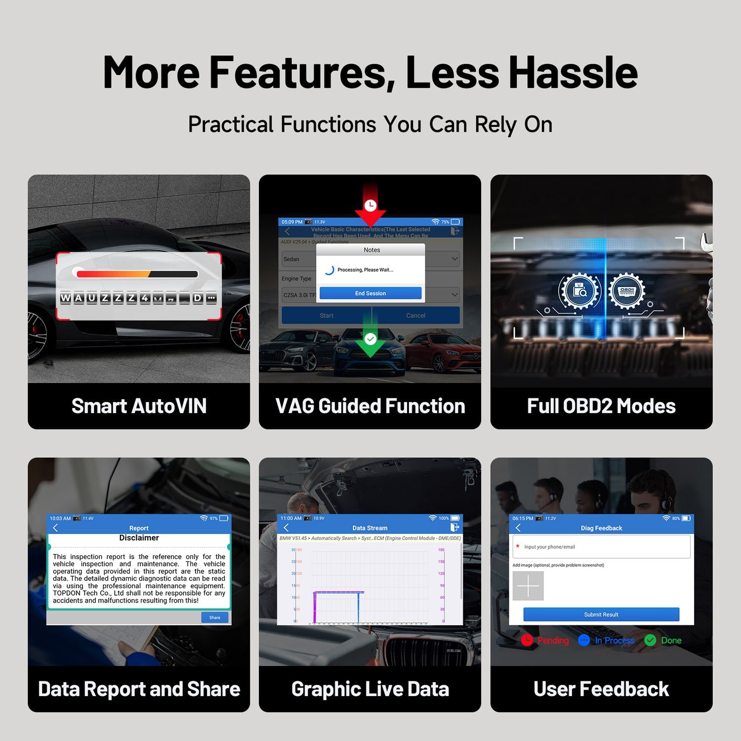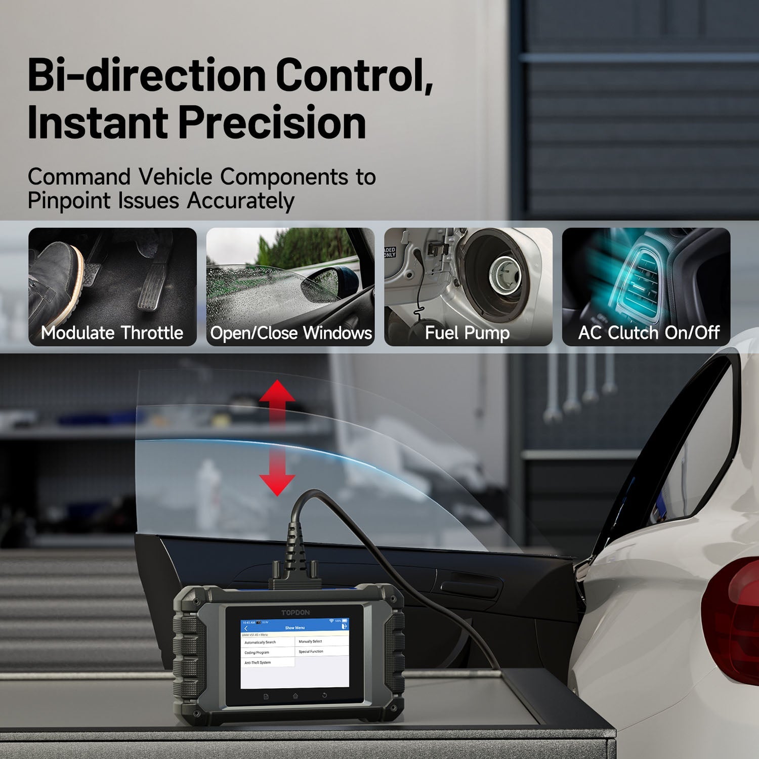 Meet the ArtiDiag EU, TOPDON’s car diagnostic tool tailor-made for 15 European vehicle models including BMW, Mercedes-Benz, VAG, and their affiliated brands. Delivering exceptional value, this scanner features advanced ECU coding, full-system diagnostics, and complete maintenance functions, perfect for workshops specializing in European models and DIYers seeking a cost-effective solution to cover all diagnostic needs. Backed by permanently free software updates, ArtiDiag EU guarantees you will stay ahead of any challenges.