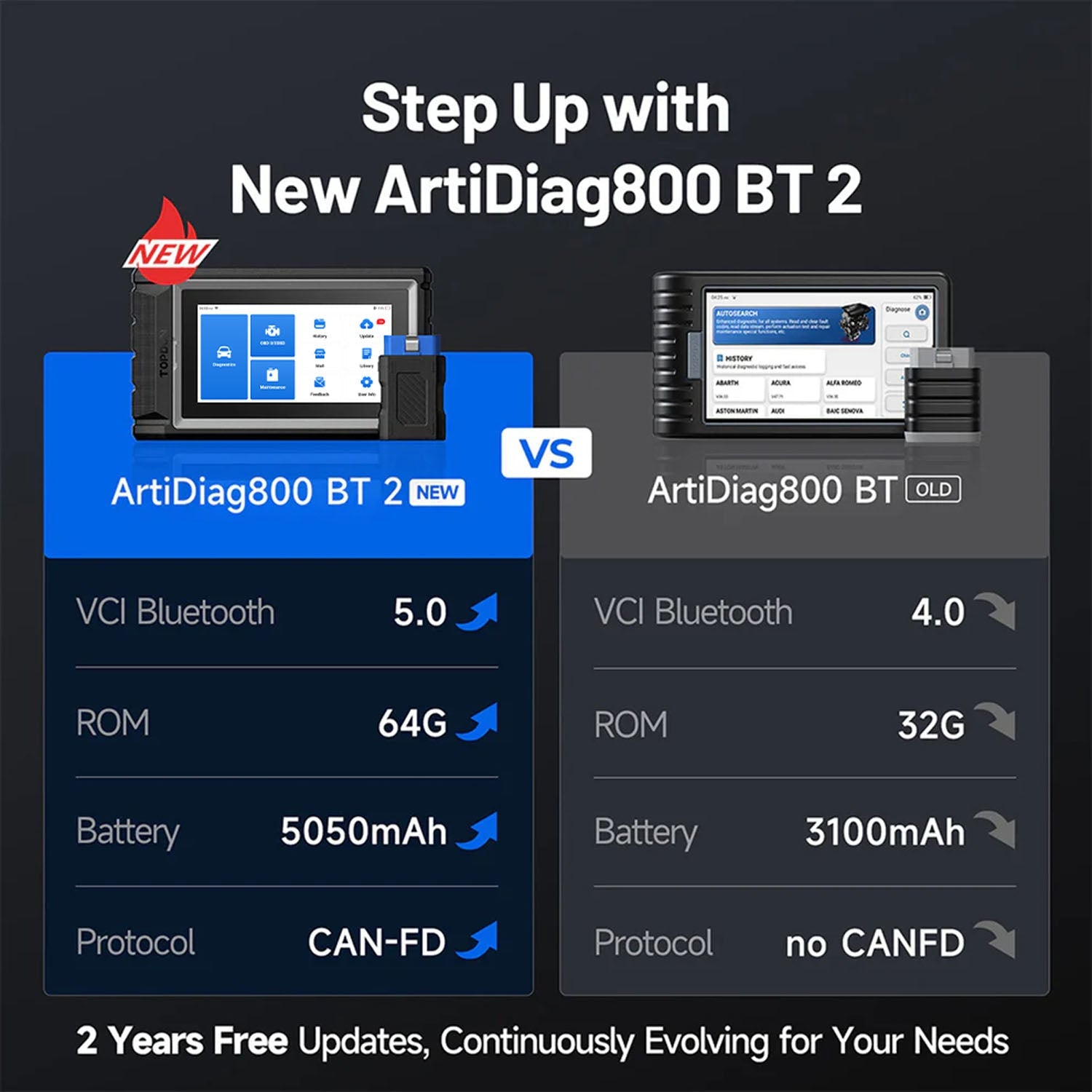 Enhance your diagnostics with the upgraded TOPDON ArtiDiag800BT 2, now featuring CAN-FD protocol support and FCA Gateway capability for expanded coverage, including Chrysler, Fiat, and GM models. This tool offers 28 essential service functions such as oil resets and window calibration, all easily managed via Bluetooth for seamless repairs. With 64GB of storage, a powerful 5050mAh battery, and two years of free software upgrades, it’s the perfect companion for advanced automotive services.