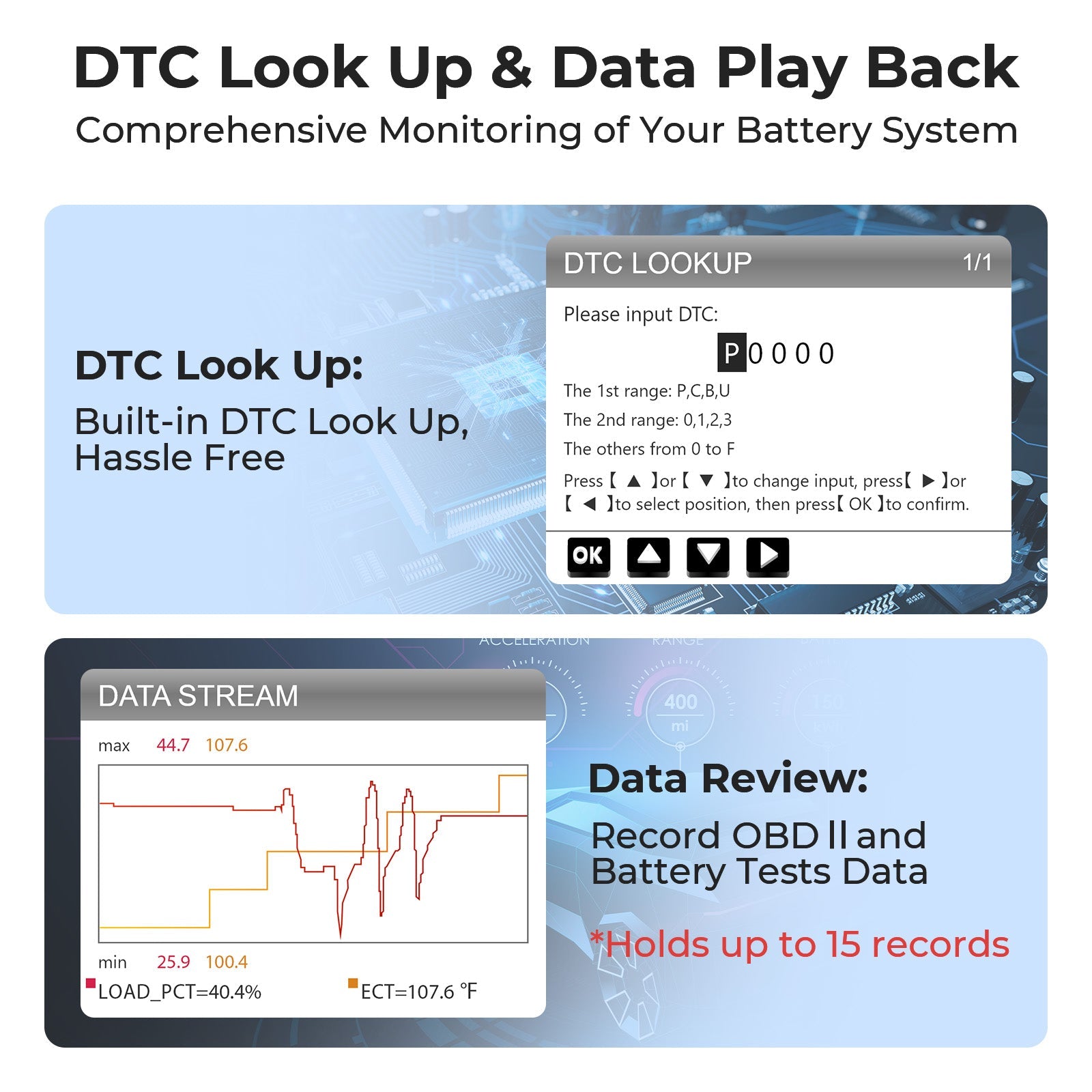 - Review your data records includes OBDII and battery test-related information. The ArtiLink500B automatically stores important information for easy playback at any time.
