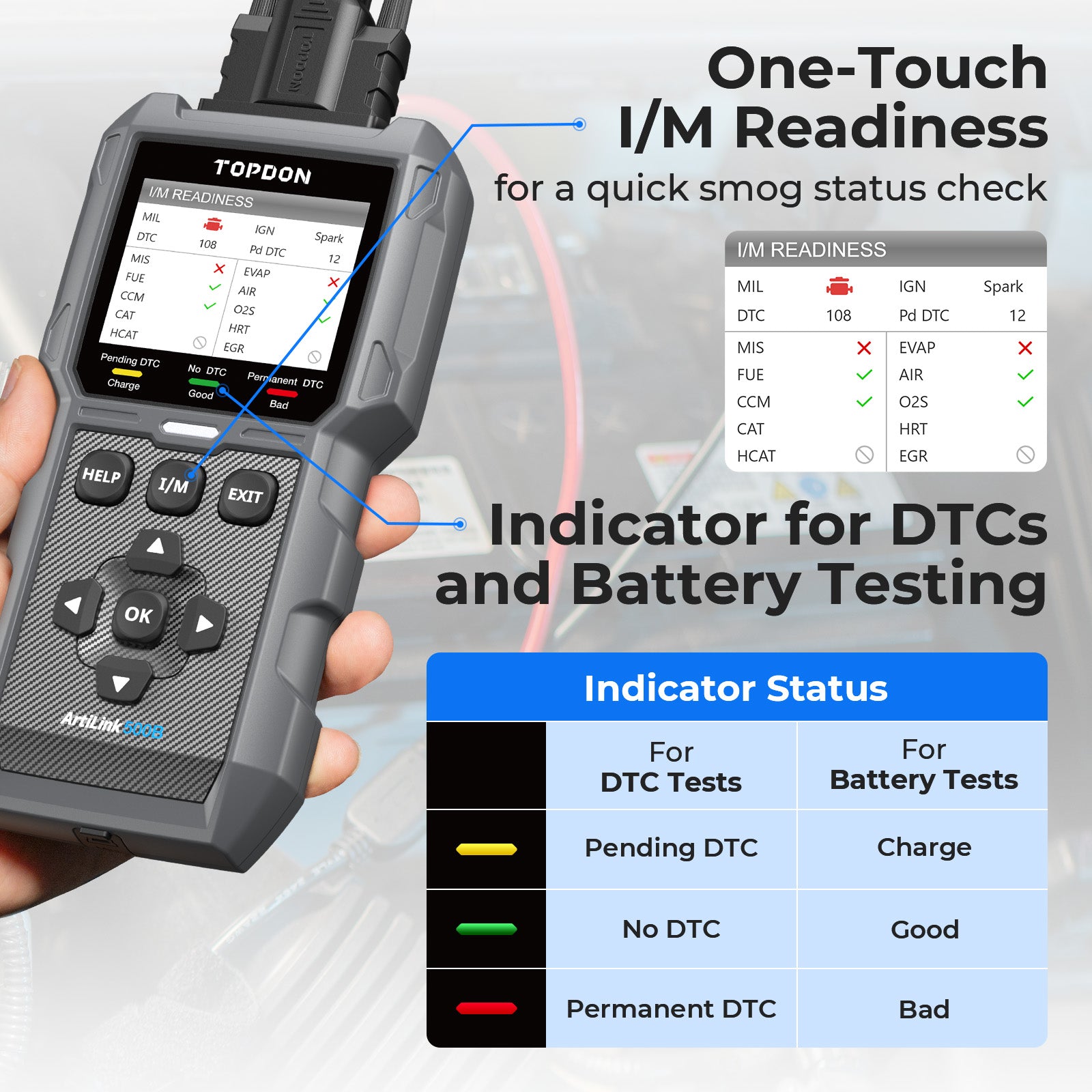 - This tool includes a one-touch I/M ready button for a quick smog status check. With this function, users can analyze a car's carbon emission far faster and more efficiently.