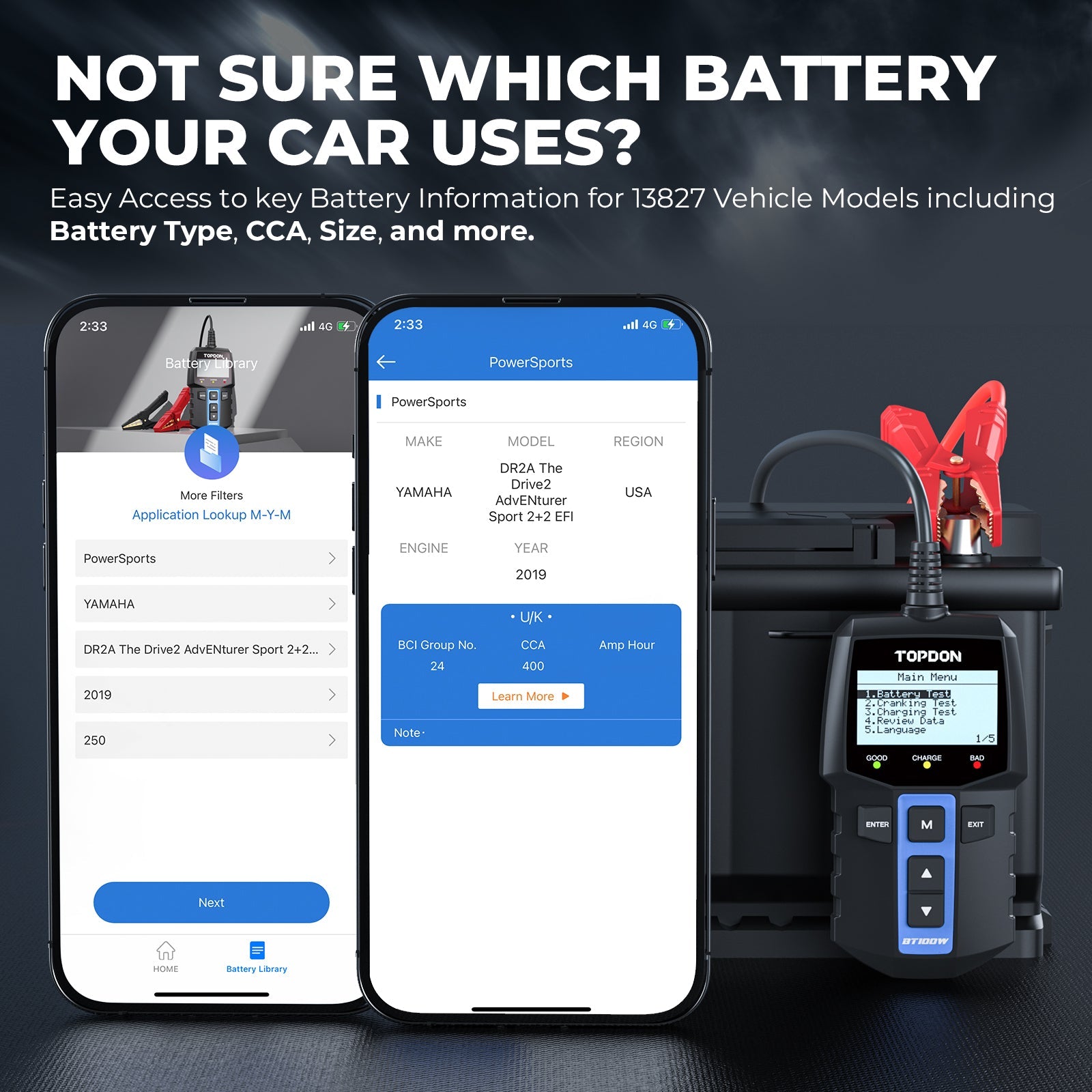 The BT100W’s battery library allows for easy access to key battery information such as battery standards, CCA, specifications and more.