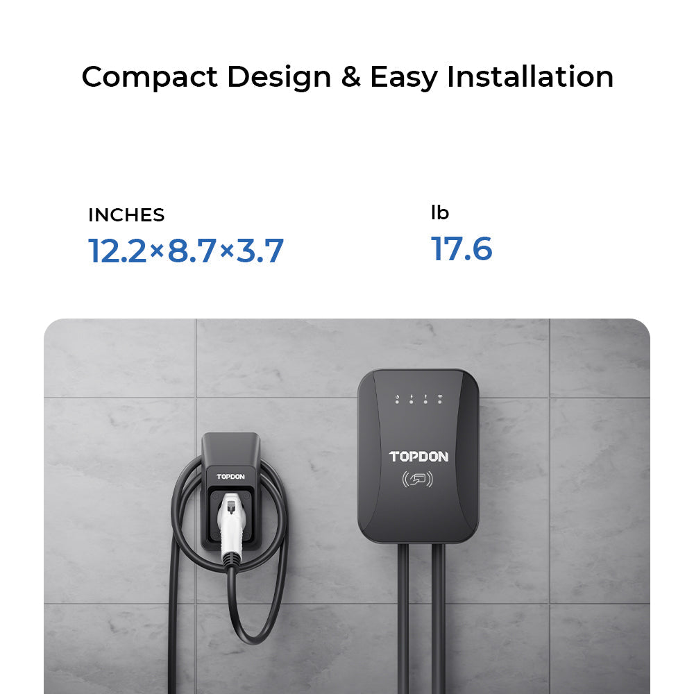 - Equipped with a 16.4ft rugged charging cable made of PVC and copper, which can accommodate up to 40A. The charger can be saved in the socket when not in use; coil the charging cable and hang it over the socket for storage.