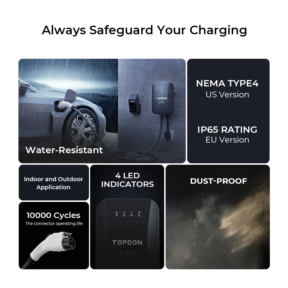 - The PulseQ is made of flame-retardant materials and is packaged in a dust-proof and water-resistant case that’s built to NEMA TYPE 4 standards; suitable both for indoor and outdoor application, and backed by the TOPDON 3-year warranty. The connector operating life is up to 10000 cycles.