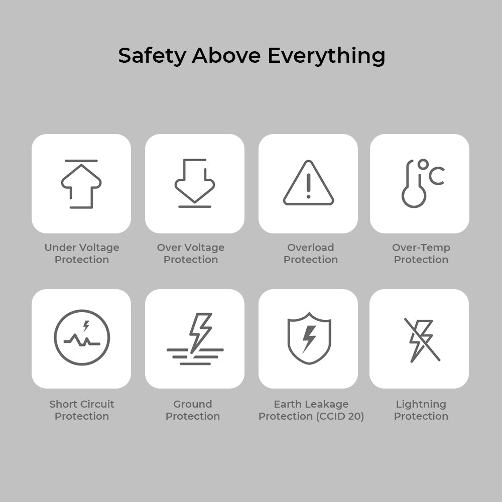 - Safety features include Under Voltage protection, Over Voltage protection, Overload protection, Over-Temp protection, Short Circuit protection, Ground protection, Earth Leakage protection (CCID 20), and Lightning protection.