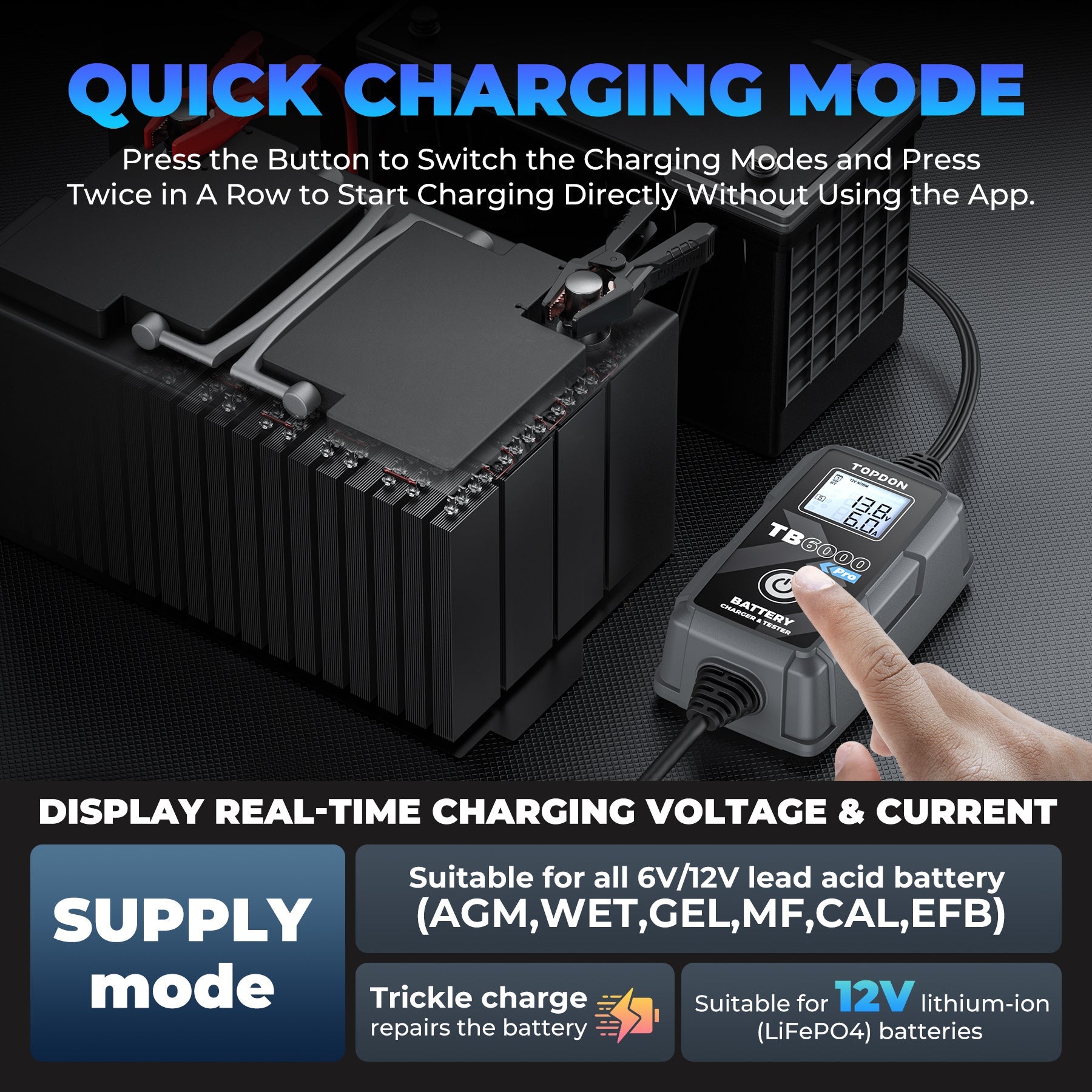 - TOPDON’s patented 9-step smart charging gives your lead-acid battery an optimized, maintained, and integrated charging process. When connected, not only will the TB6000Pro charge the battery, but it will desulfate and act a battery maintainer to truly repair your car battery. Moreover, the TB6000Pro specializes in offering a specialized smart charging mode for lithium batteries.