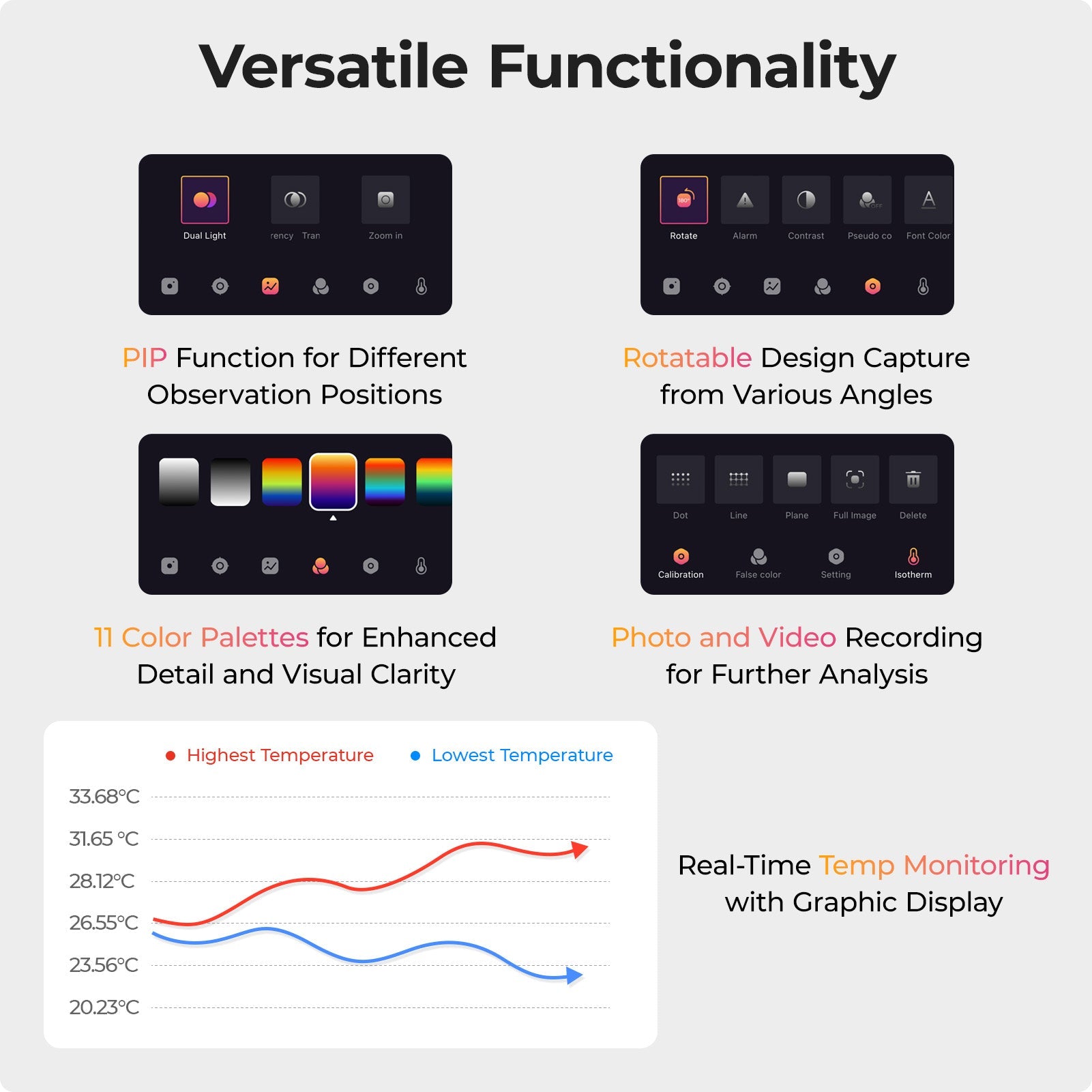 2.Customize temperature limits using a variety of color palettes for display.
